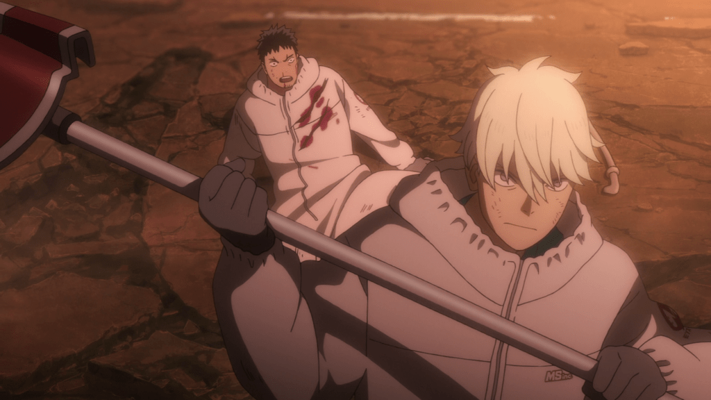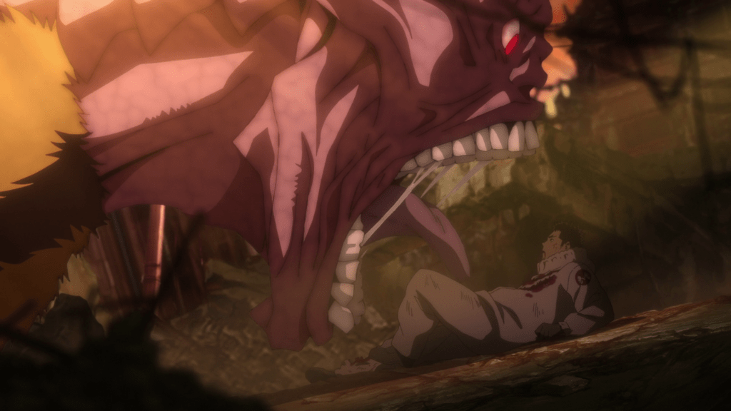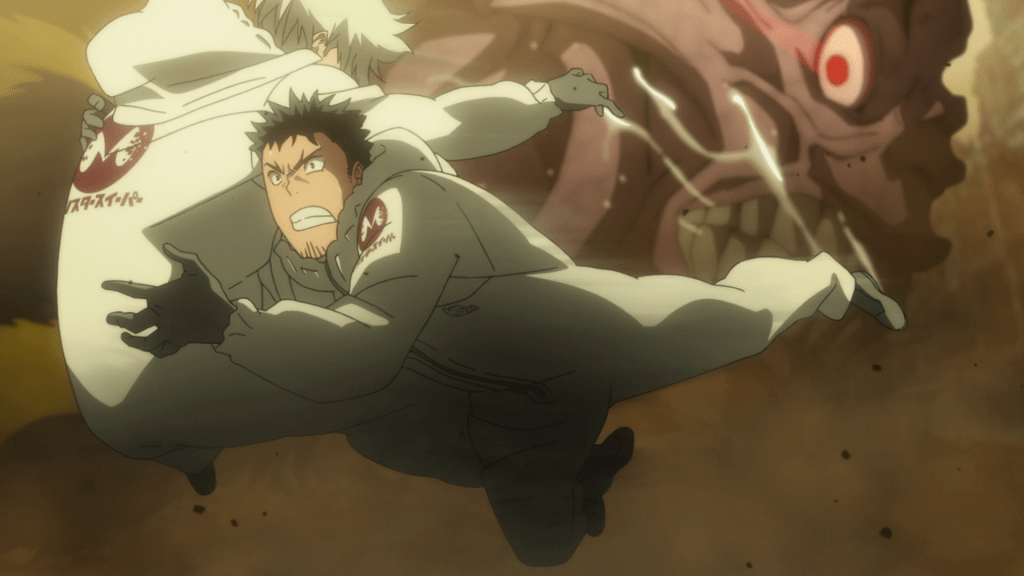 Halfway through the episode, Kafka and Reno get ambushed by a yoju, a smaller type of kaiju compared to the big one shown at the beginning. Kafka holds the monster off and allows Reno to run off and call in the Third Division, though the rookie returns to save Kafka and fend off the yoju until help arrives. This scene does a solid job establishing the heroism of both Kafka and Reno. Kafka shows off some quick thinking and athleticism and he doesn’t hesitate to sacrifice himself for Reno. Even when he gets severely injured, he still tries to stand up and fight. Likewise, Reno returns to save Kafka, arguing that he wouldn’t make it in the Defense Force if he allows a friend to die. It’s a good display of character that makes you want to see these two men realize their dreams.