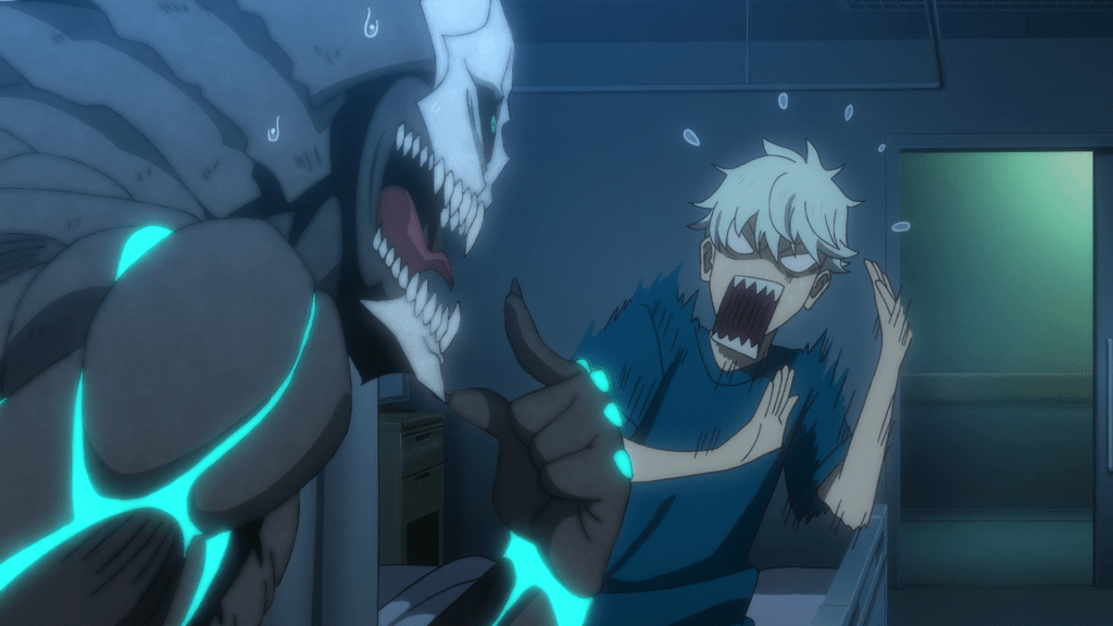 Eventually, the Third Division arrives and defeats the yoju. Following the ordeal, Kafka and Reno recover at a hospital. Just as the former decides to re-apply for the Defense Force, a small and parasitic kaiju suddenly appears and it allows itself to be ingested by Kafka, granting him the ability to become a human-sized kaiju. Most likely, you’d already know that Kafka can do this as it was advertised ahead of time. Still, this does feel out of the blue and it’ll likely only make more sense as time goes on. I do like how Kafka’s kaiju design walks a fine line between intimidating and goofy. This is best demonstrated with his and Reno’s reaction at the new form, their horror at what just happened is warranted but the show does dial it to an exaggerated degree for a good laugh.