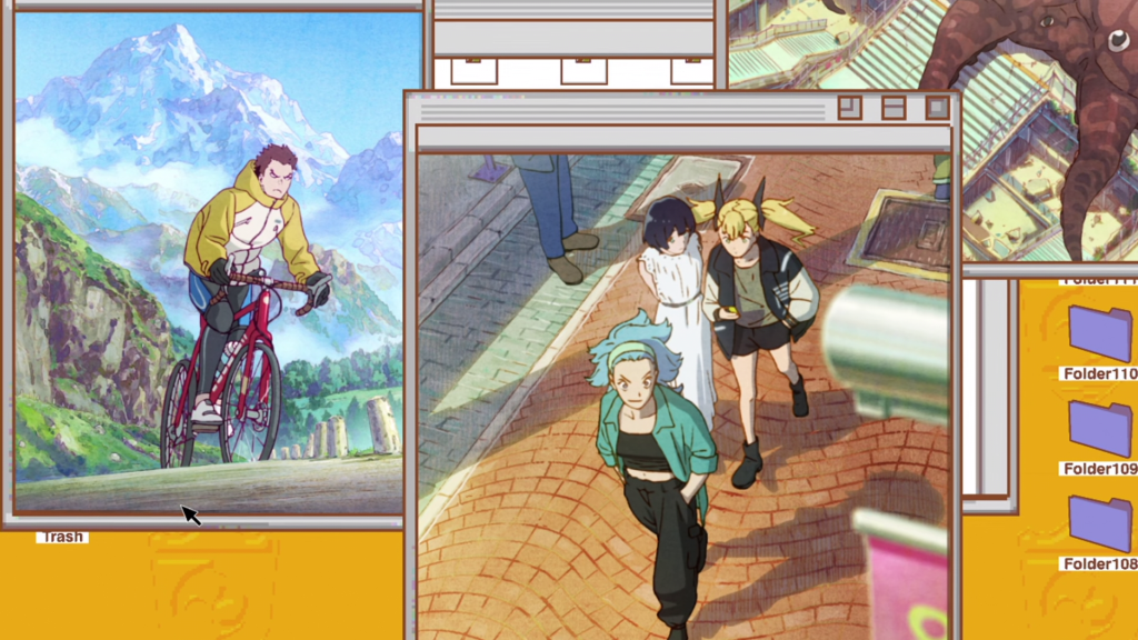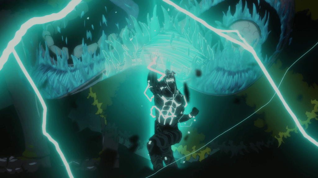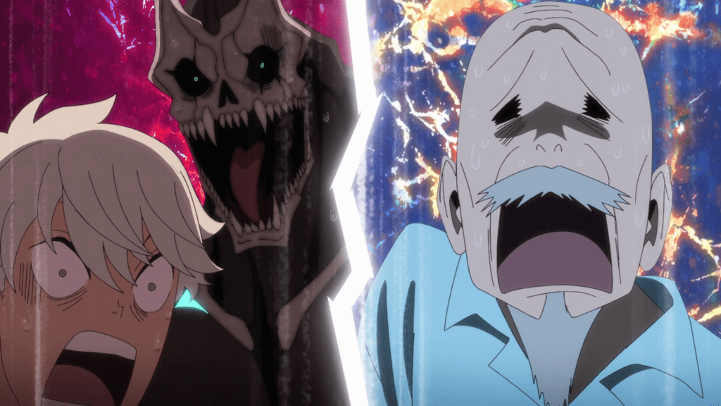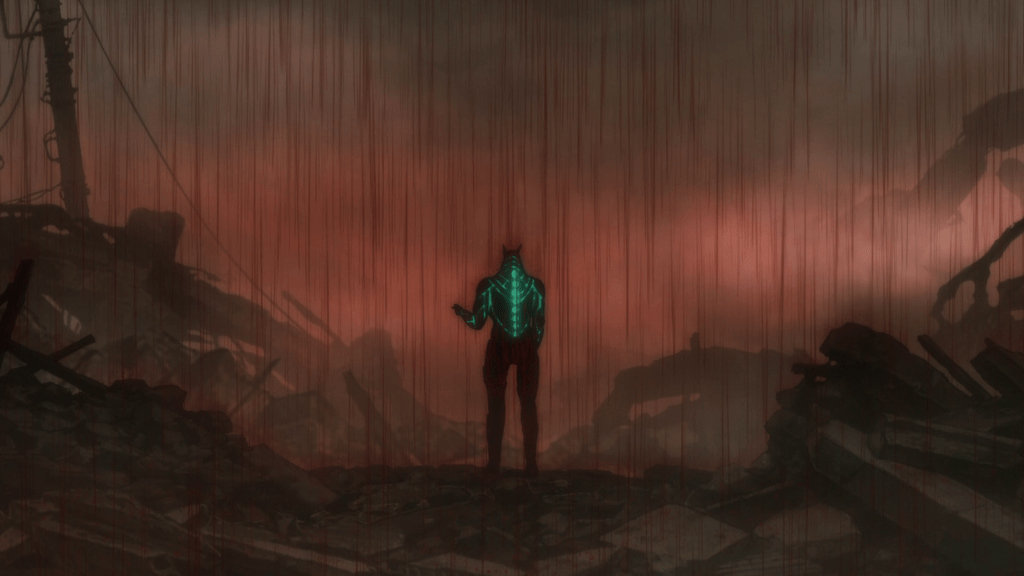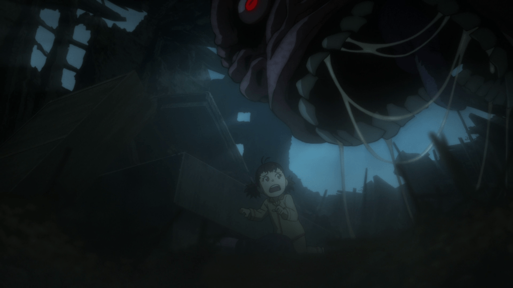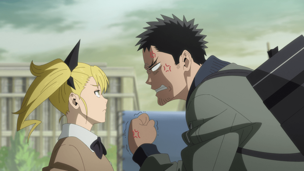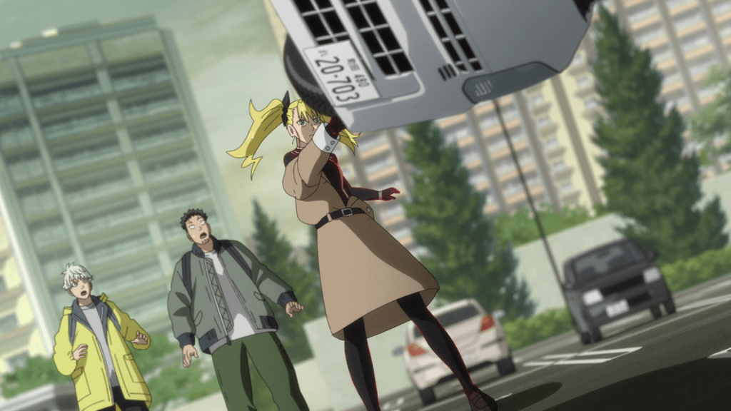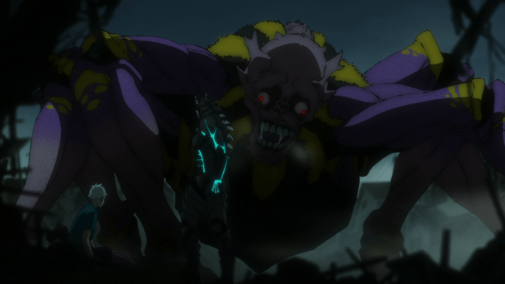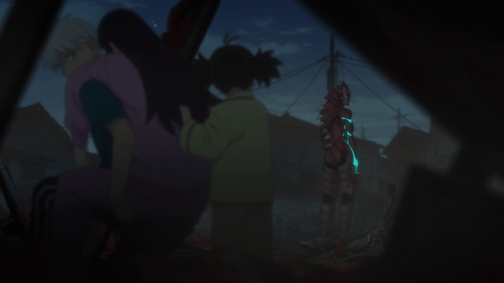 Episode 2 picks up when Kafka detects a yoju wreaking havoc and the monster set its sights on a defenseless little girl and her injured mother. Even though he and Reno should flee to avoid getting caught, Kafka can’t bring himself to let innocents die so he punches the yoju as hard as he can, killing it in the process. The art and animation in this scene is superb; especially with the glow effects on Kafka’s punch and the kaiju’s blood raining down in the aftermath.