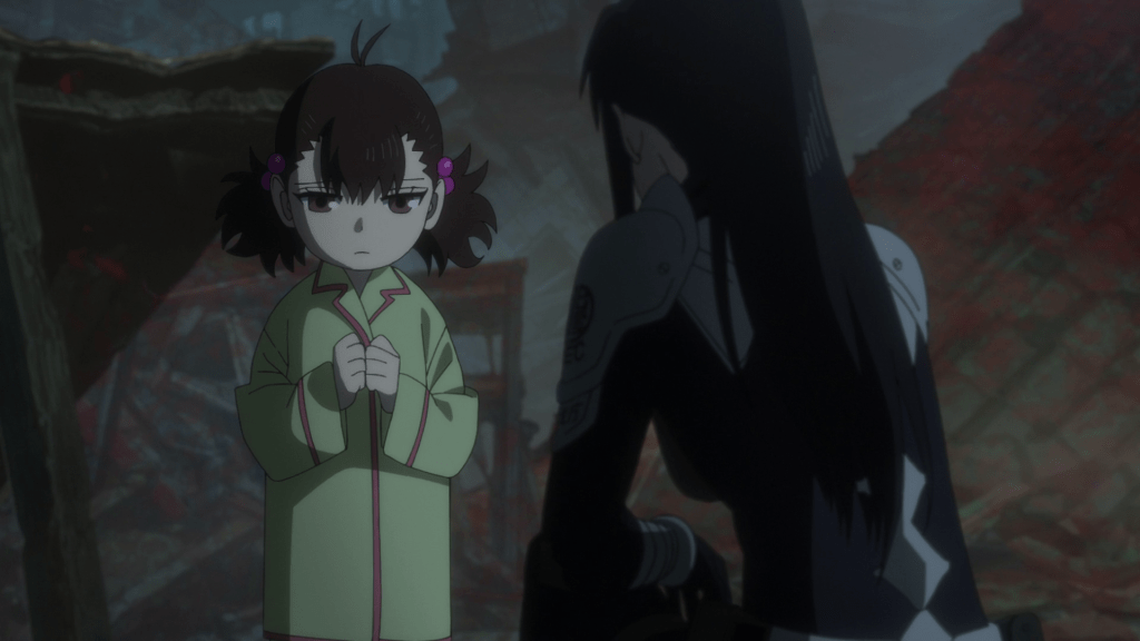 Knowing that he’s a scary monster, Kafka bows out with Reno but not before the little girl thanks him for saving her and her mother. I really like that this is what allows Kafka to revert back to human form for the first time. The girl is still scared to death but she ultimately approaches Kafka as if he’s a human (which he technically still is but you get the point) and that’s what reverses the transformation. That gratitude also assures Kafka that he can still be a hero, motivating him to re-apply for the Defense Force (even if it’s probably not the best idea right now).