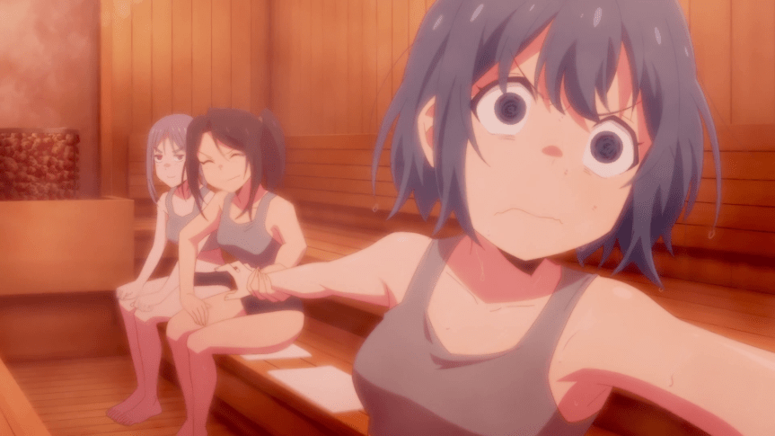 Rather than practice golf directly, both Haruka and Ayaka decide to have Minami train in other ways that’ll help her successfully hit past the 100 yard mark. Haruka has Minami hit the gym and work on her lower body. Ayaka on the other hand, holds a yoga session and provides some relaxing tea for everyone. I love how this slowly becomes less about helping Minami train and more just a competition between Haruka and Ayaka. The two have completely different methods and they disagree on which one is better. Minami tries to play both sides by saying she’ll do both approaches but that only makes her friends even more competitive. After the yoga session, Haruka and Ayaka takes Minami to a sauna. That probably is a good way to train or unwind but really, Haruka and Ayaka are here to settle the competition by seeing who can last in the sauna longer. There actually is no reason for Minami to be here, other than the fact that this whole situation started because of her. It also may just be an excuse for fanservice but this is an anime I’m talking about here so what else is new?