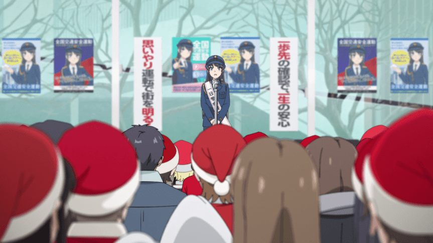 Having reunited with Takumi and reconciled with herself, Nene gives up trying to become Touko Kirishima and she becomes fully visible again. However, Nene notes that she is not the only Kirishima wannabe so she drives everyone to the police department’s events, where a bunch of invisible Santas have gathered to see Mai. I brought up last post that this show only scratches the surface on how widespread Puberty Syndrome is this season so kudos for making it extremely relevant at the very end of the last arc. Oddly enough, the Santas don’t actually do anything themselves. They kind of just stand in the crowd watching Mai give her PSA. But because they’re invisible, the other onlookers get confused as to why the area is so packed, eventually escalating into a crowd collapse that damages the set. A set of loudspeakers begin to fall on Mai, thereby setting up the accident predicted in Tomoe’s dream, but Sakuta rushes in and takes the blow instead. The injury is seemingly enough to shock the Santa Clauses out of their stupor, making them let go of their Touko Kirishima obsession and become visible to everyone else again.