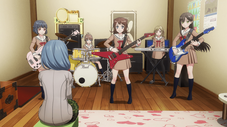 By chance, Kasumi meets Rokka after school and the two end up hanging out at the latter’s place. Kasumi then gets a call from the others and invites Rokka over to Arisa’s place to hang out with PoPiPa during their practice session. There have been a couple of scenes beforehand where Rokka is fangirling over PoPiPa but it’s this moment where you learn the exact affinity Rokka has for them. During the hangout, Rokka reveals to everyone that she once left her home in Gifu to see Space’s final live show. After seeing PoPiPa’s performance that day, she became inspired to form a new band. She convinced her parents to let her move to her relatives’ place in Tokyo by getting in Haneoka’s scholarship program. What I like how about this reveal is how unprecedented it is for PoPiPa. I imagine the band was content with simply putting on a good concert for their audience, nothing less but nothing more as well. With Rokka however, they finally meet someone where their music actually left a deep impression.